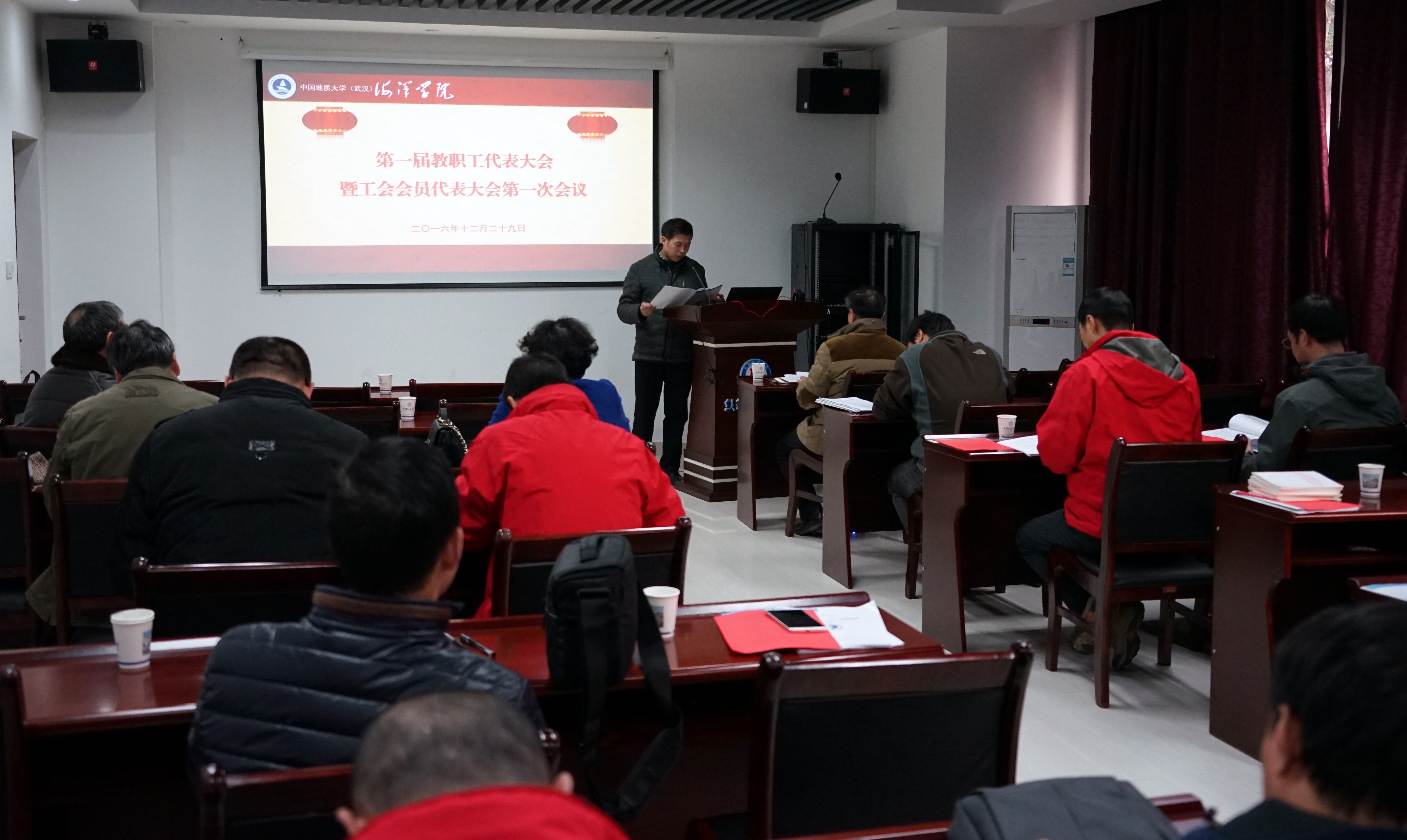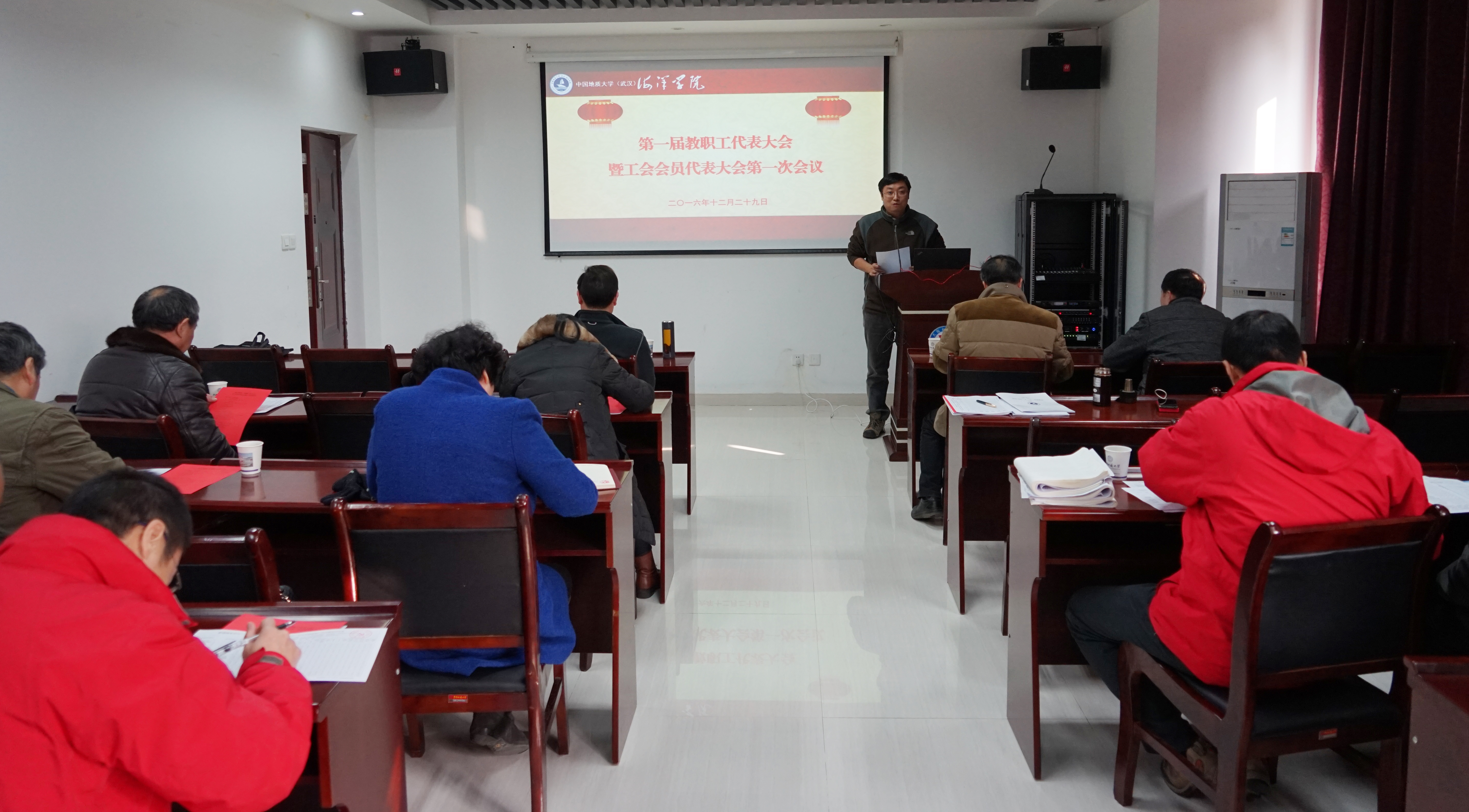 2016年12月29日,探花视频 (武汉)海洋学院第一届教职工大会第一次会议暨第一届工会会员大会第一次会议在校丝绸之路学院105室隆重开幕,会议由院党委书记解习农同志主持,副校长万祥清同志,工会副主席杨茜同志到会祝贺并致贺词。