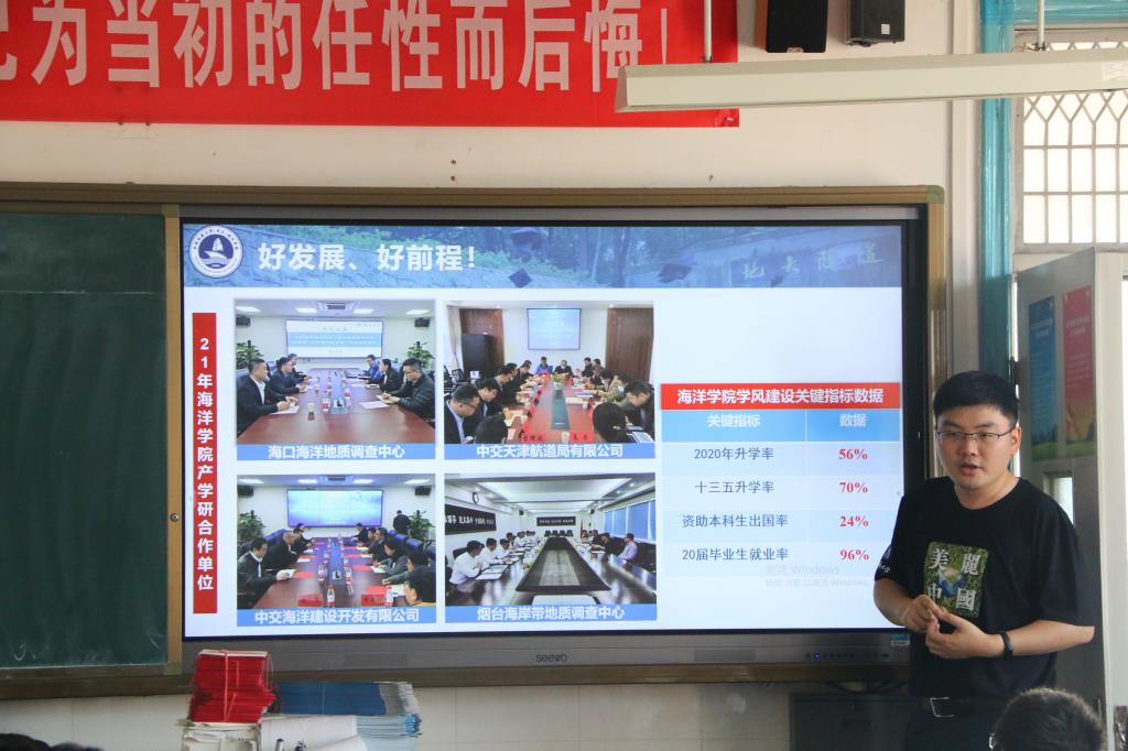为吸引中学优质生源报考,6月25日,湖北省高考分数线公布当日,探花视频 海洋科学系博士生导师雷超、海洋工程与技术副教授董友扣、学工组辅导员陈杨一行走进武汉市第十四中学开展招生宣讲,并面向高三同学进行高考志愿填报解读。