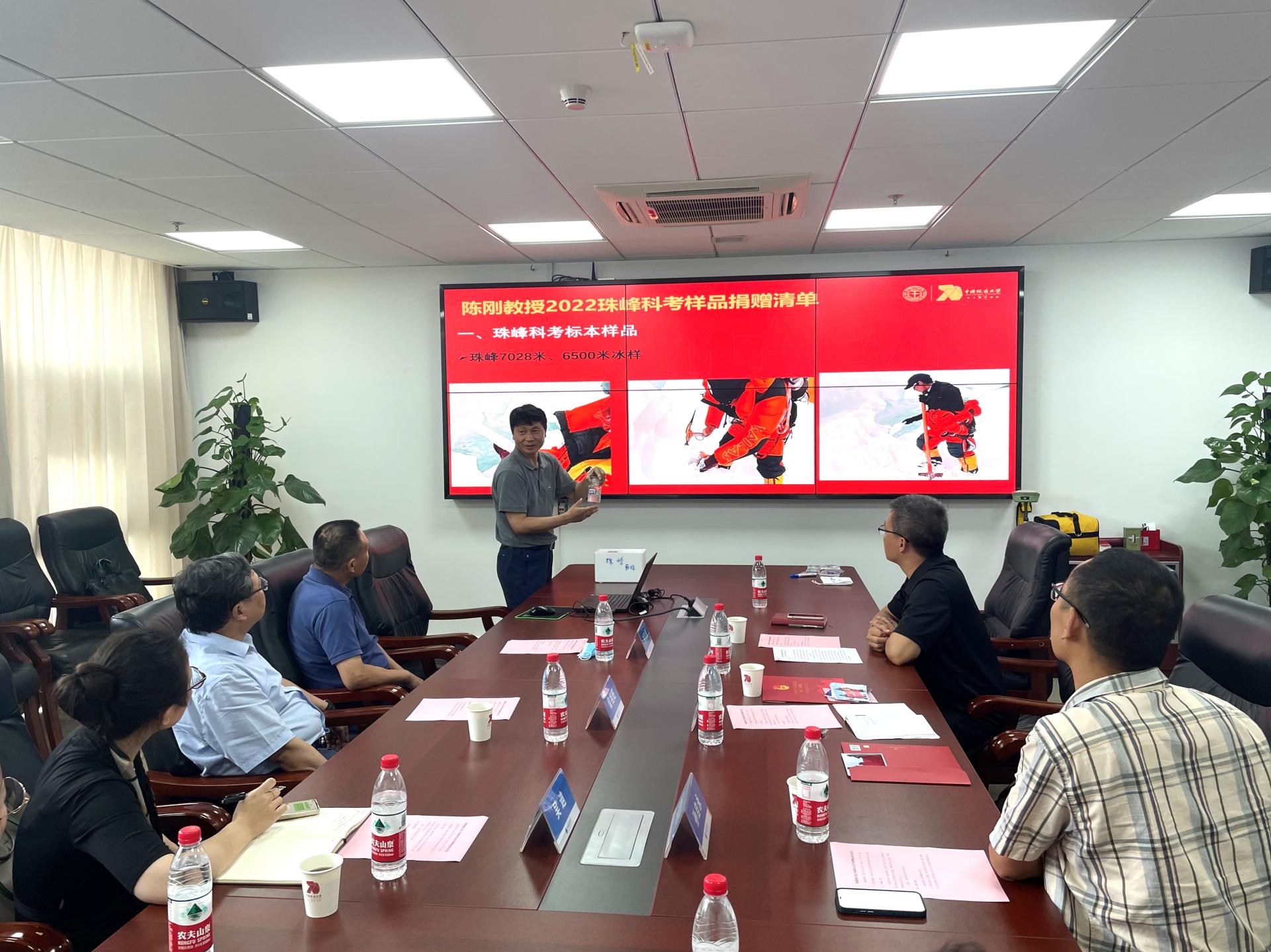陈刚教授结合珠峰科考介绍捐赠物品清单。他讲到:“此次捐赠的物品共分为‘珠峰科考样本样品’、‘登顶珠峰纪念品’、‘登顶珠峰技术设备’三类,辅以大量图片、视频资料,系统的展示了2022年珠峰登山科考的历程,期望能让学校更多师生领略珠峰风景,感悟‘地大攀登精神’内涵。”