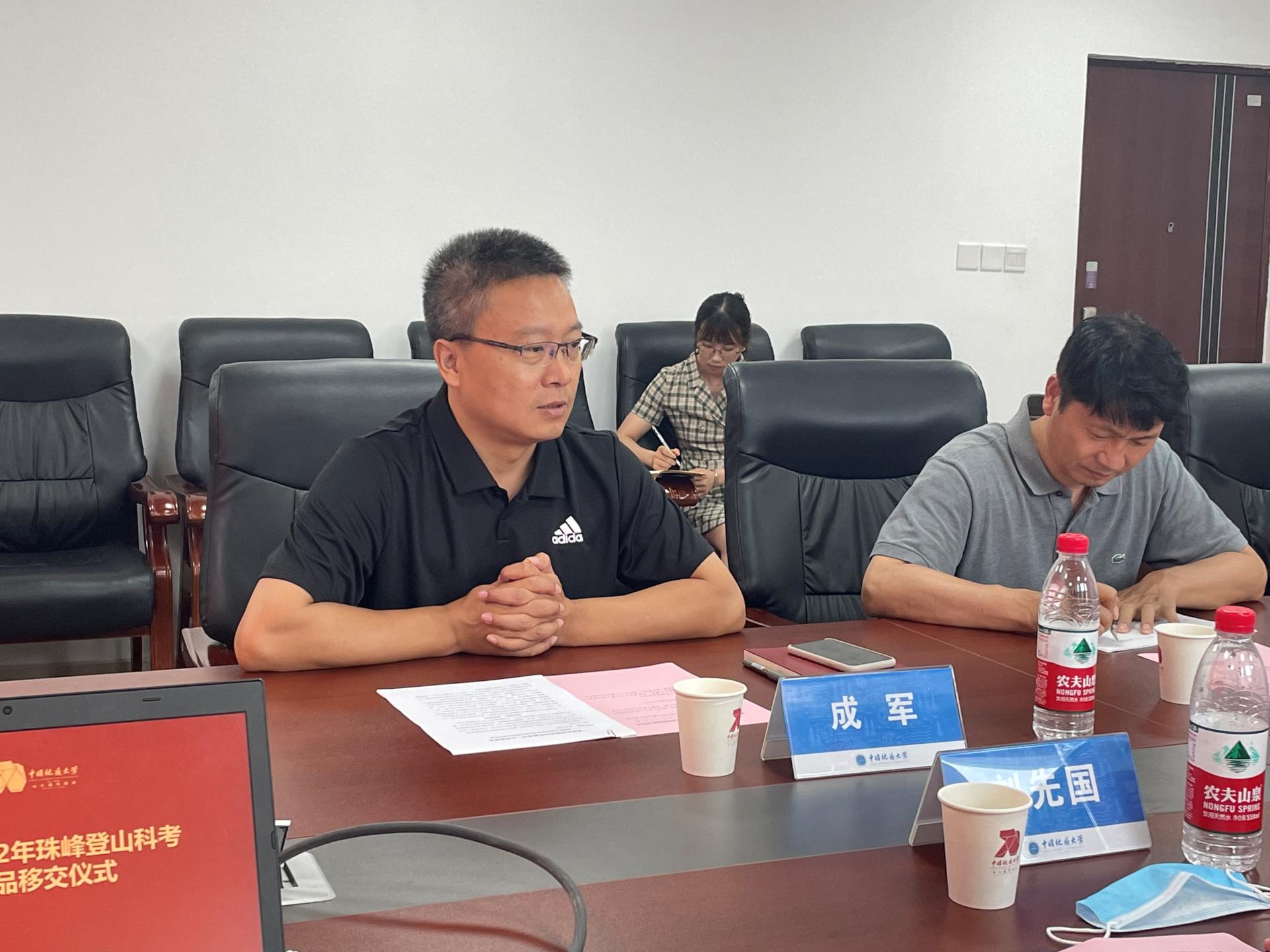 储祖旺总结讲话。他指出,此次捐赠活动是对我校“7+2”登山科考活动内容的极大丰富,并代表学校向陈刚教授的捐赠表示衷心的感谢。他强调,每一件实物都述说着攀登珠峰过程中惊心动魄的故事,接受捐赠物品的单位要保存好、运用好相关捐赠物品,最大程度的发挥其中的科研价值和文化价值。他要求,各单位要以此为契机,讲好“地大攀登故事”,刻画“地大攀登形象”,助推地大校园文化建设,为学校70周年校庆增光添彩。