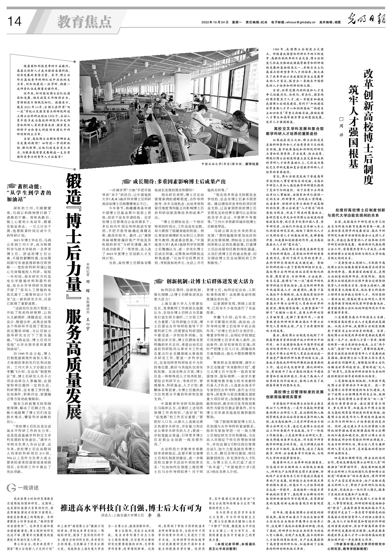 近年来,针对高校博士后队伍建设和发展,相关政策文件陆续出台,管理制度日渐规范细化。数据显示,截至2021年10月,全国已在所有“双一流”学校以及国家重点科研院所设立博士后科研流动站3352个,出站人员中很多成为高校科研院所补充师资和科研人员的重要来源、国家重点科研平台和重大科技项目团队中科研创新的主力军。探花视频 在学校政策支持下加大博士后引进力度,强化博士后工作环境保障机制,旨在让学院博士后群体迸发出更大活力,为服务高质量发展锻造一支具有国际竞争力的青年人才后备军。