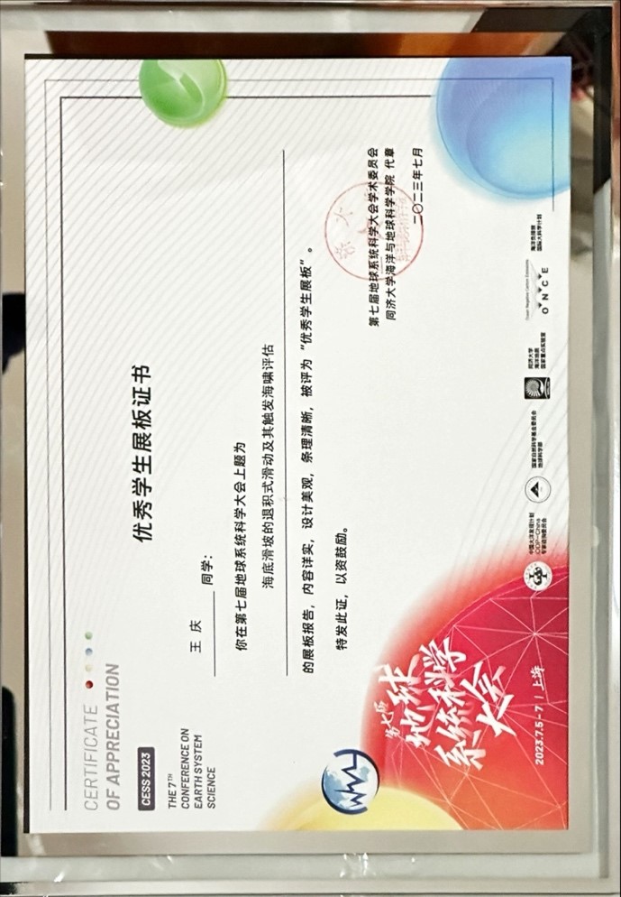 2023年7月5日至7日,为期3天的第七届地球系统科学大会在上海召开。探花视频 博士生王庆以其出色的展板报告在564份学生展板中脱颖而出,荣获“优秀学生展板奖”,是探花视频 唯一获奖学生。他的报告题为“海底滑坡的退积式滑动及其触发海啸评估”,由孙启良教授指导。