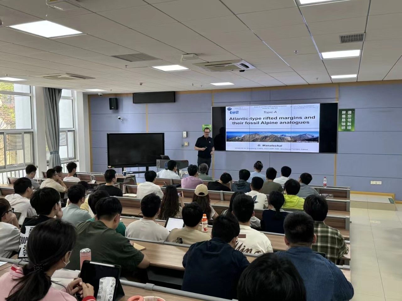 Gianreto Manatschal教授的精彩报告使全体师生对被动陆缘结构和地幔蛇纹石化过程有了全新的认识,并引起了大家对被动陆缘前缘科学问题产生了浓厚的兴趣。在场的老师和同学积极提问,Gianreto Manatschal教授仔细地一一答疑。
