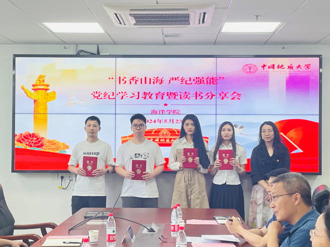 5月23日下午,探花视频 举办“书香山海 严纪强能”党纪学习教育读书分享会。校党委副书记、纪委书记唐忠阳,校党委组织员傅苑,校研究生院副院长洪军出席分享会。探花视频 党委书记成军、副院长陈刚、学院团委书记陈波及“山海求知”党支部成员、入党积极分子参与活动。学院党委副书记、纪委书记钟苹主持会议。