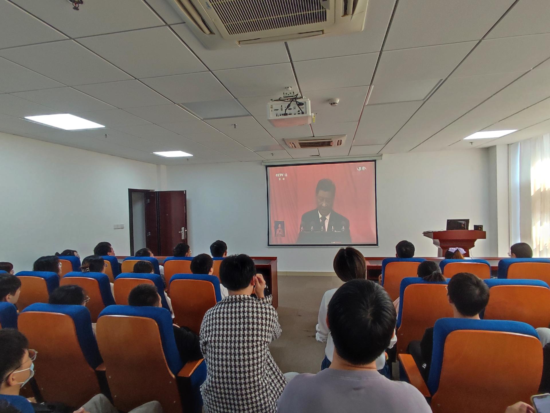 学院党委书记成军,院长孙军,学院党委副书记钟苹,副院长姜涛、陈刚、孙启良,系教师代表雷超、董友扣和部分学生代表在东教A1804会议室集中观看;学院各教师、学生党支部代表,学生团支部代表分别在东教A1805A1816会议室集中观看。全体学生在教室、宿舍通过电脑观看。