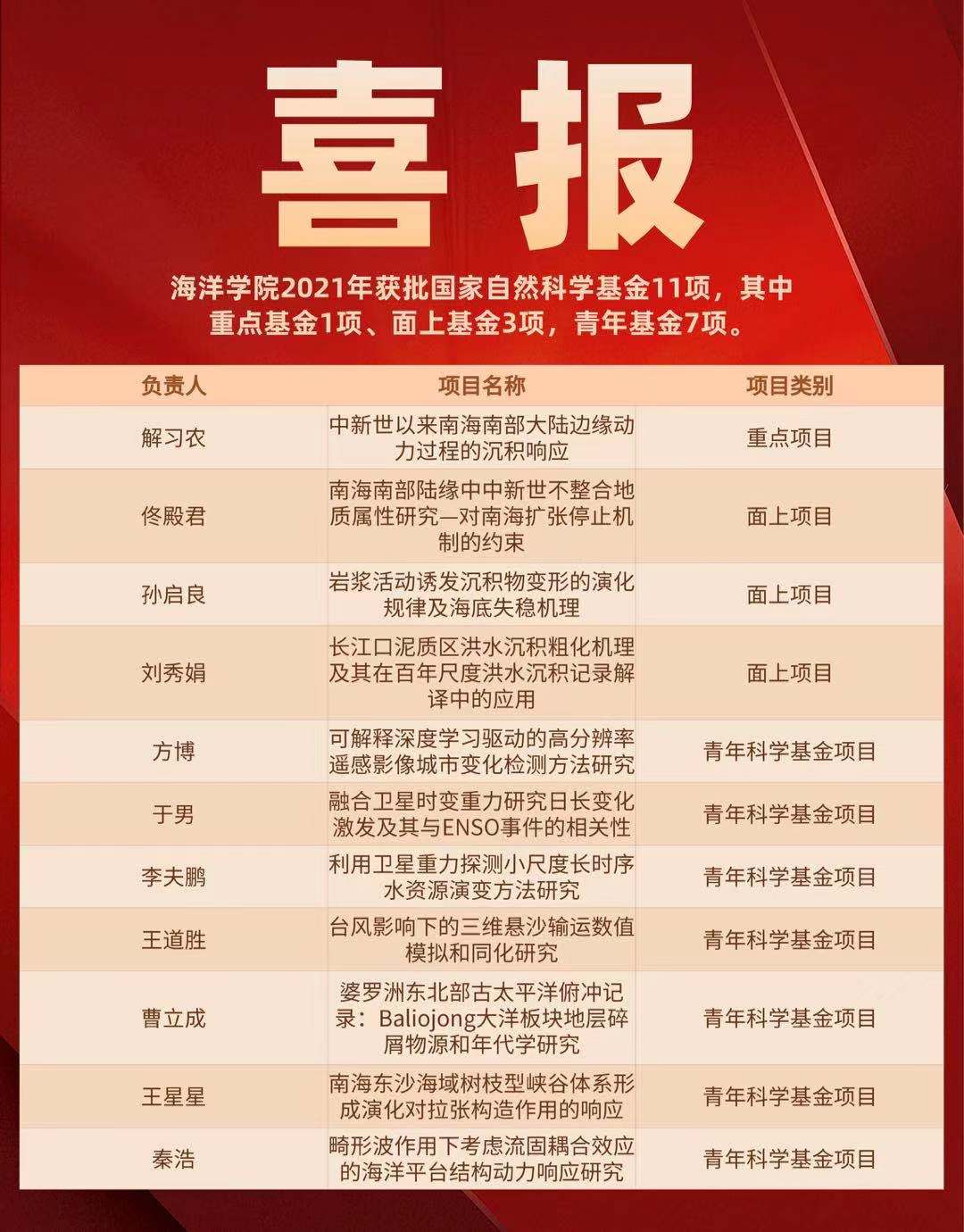 近日国家自然科学基金委员会公布了2021年度国家自然科学基金申请项目评审结果。探花视频 共获批国家自然科学基金11项,其中重点基金1项、面上基金3项,青年基金7项。在此,特向获得资助的项目负责人表示祝贺!