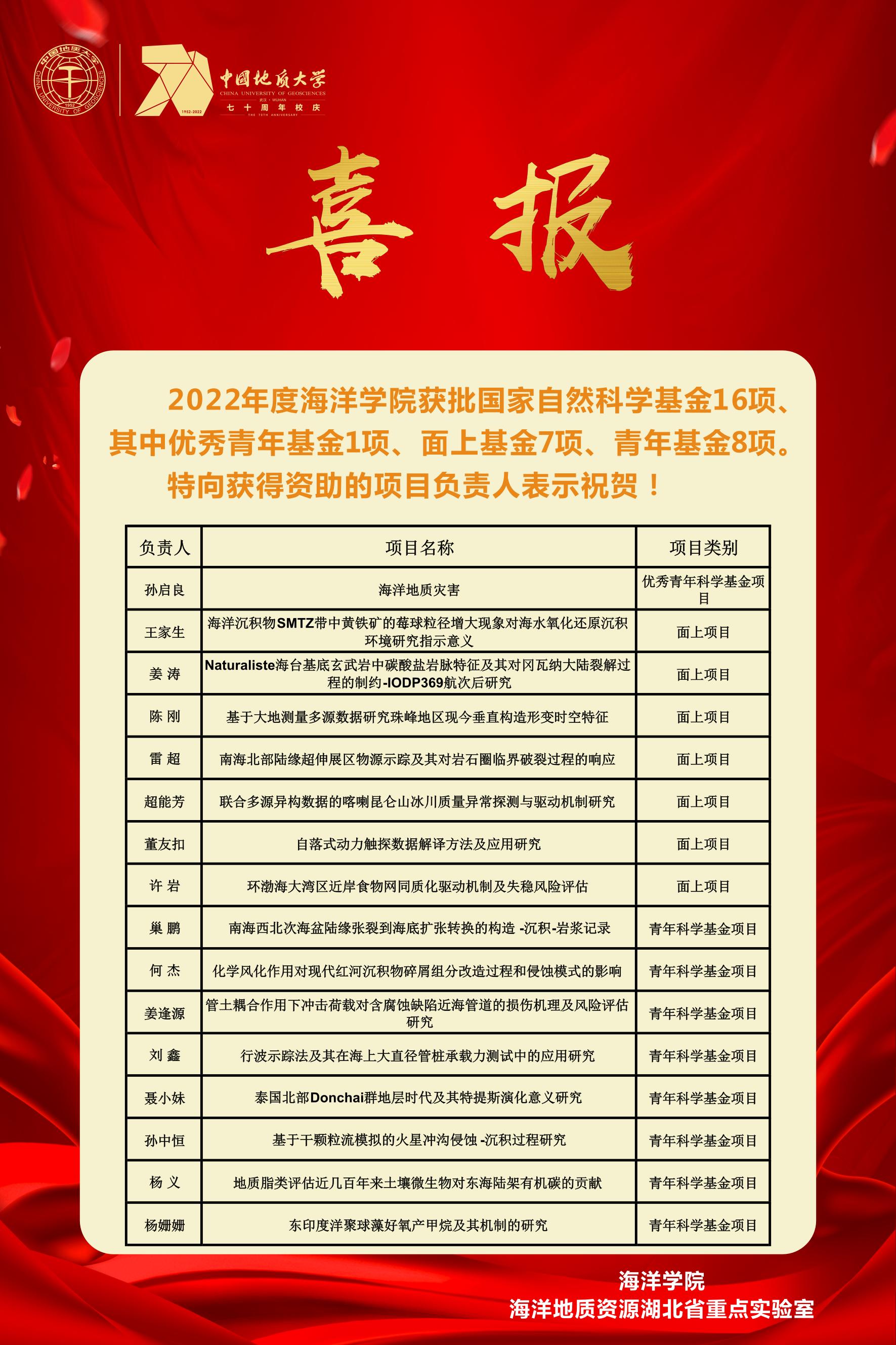 近日国家自然科学基金委员会公布了2022年度国家自然科学基金申请项目评审结果。探花视频 共获批国家自然科学基金16项,其中优秀青年基金1项、面上基金7项,青年基金8项。在此,特向获得资助的项目负责人表示祝贺!