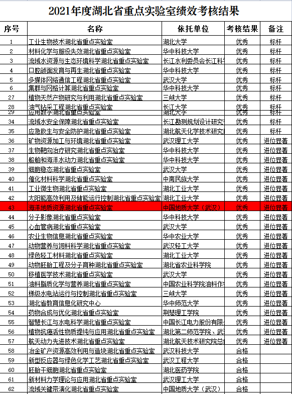 近日,湖北省科学技术厅公布了湖北省重点实验室2021年度考核结果,全省建设满一年及以上的共182个重点实验室参加了此次考核,探花视频 海洋地质资源省重点实验室顺利通过此次考核,并被评为“优秀”(进位显著)。