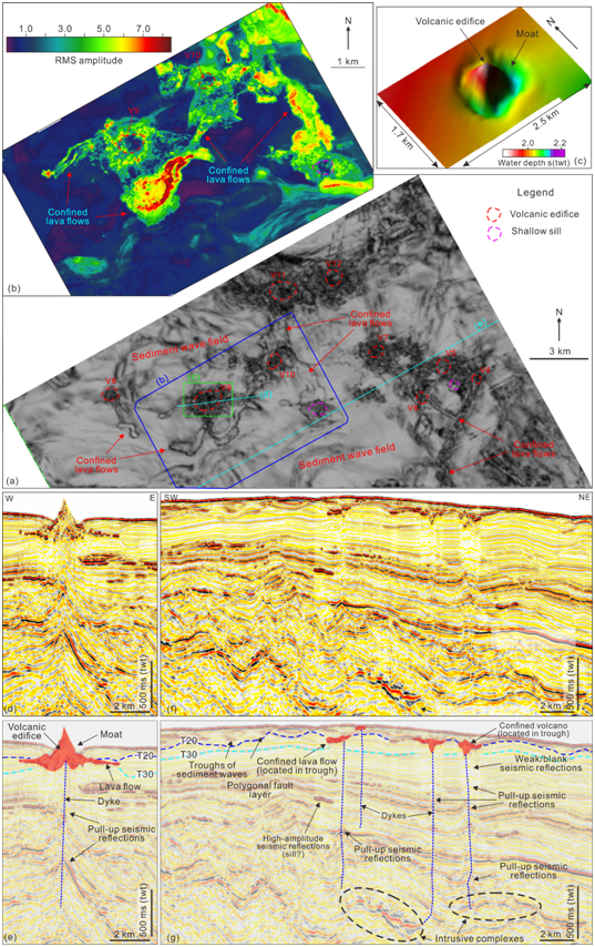 1:火山及熔岩流特征及岩浆运移通道。A:火山及熔岩流底界面的方差体特征。熔岩流主要分布在沉积物波(Sediment waves)的凹槽内(Confined lava flows)。V1-V13为研究区内的火山;B:火山及熔岩流底界面上下30毫米均方根振奋。熔岩流主要表现为强振幅根振奋(暖色),火山(冷色)为熔岩流所包围;C:研究区编号9火山(V9)的三维特征。该火山表现为锥形,并且周围为底流形成的凹槽(Moats)所环绕;DE:穿过火山9的地震剖面及其解释。在火山体之下可以清晰的观察到上拉的地震反射特征。岩墙可能存在其中;FG:地震剖面及其解释。可以清楚的观察到熔岩流赋存在沉积物波的凹槽之中,以及火山体或熔岩流之下的岩墙和正断层。