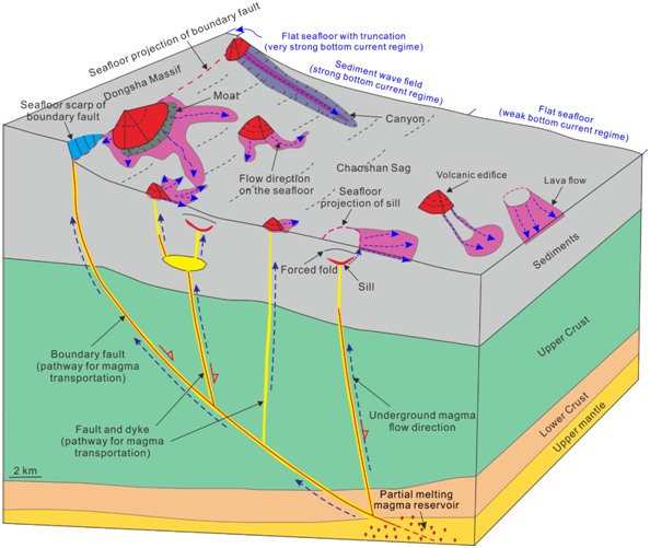 2:南海北部裂后岩浆的形成、运移和喷发模式。部分熔融的物质首先沿拆离断层向上运移,喷发出海底或者侵入上地壳/沉积层。在浅部岩浆的运移主要通过岩墙和正断层。喷发物质在海底主要受控于底流及重力流所塑造地貌
