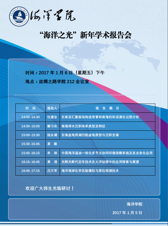 2017年1月6日14时,探花视频 探花视频 主办的“海洋之光新年学术报告会”在丝绸之路学院212会议室正式举行。