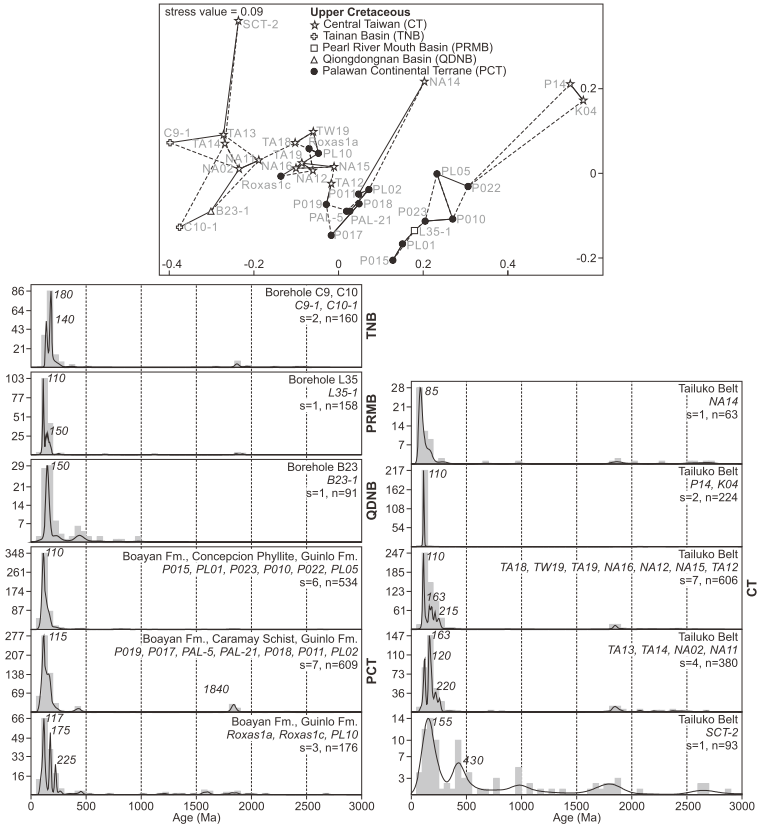 图2 研究结果示例:南海地区白垩系样品碎屑锆石U-Pb年龄信号对比 |