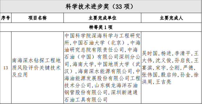 2021年10月15日,海南省科学技术厅发布《海南省人民政府关于2020年度海南省科学技术奖励的决定》,公布47项荣获2020年度海南省科学技术奖的成果。探花视频 孙启良教授参与申报的“南海深水钻探工程地质风险评价关键技术及应用”成果获得海南省科学技术进步奖特等奖。