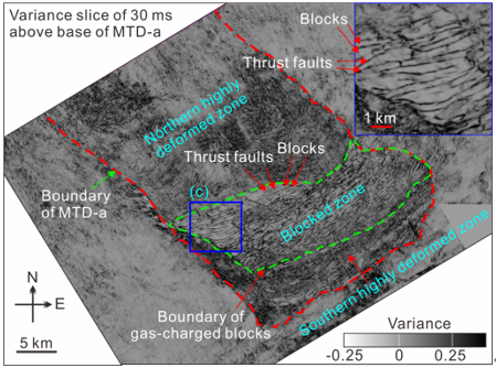 图2:海底滑坡(MTD-a)、逆冲断层(Thrust fault)和断块(Block)平面特征及分带