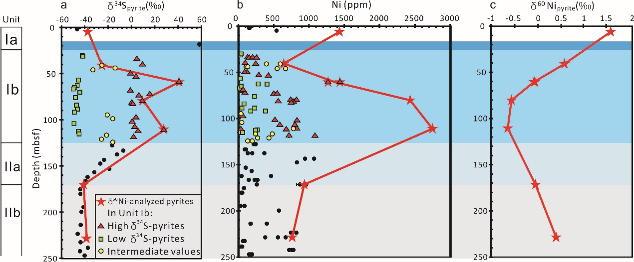 在海洋沉积物中,有机质参与的硫酸盐还原作用(OSR, organoclastic sulfate reduction)和硫酸盐驱动甲烷厌氧氧化作用(SD-AOM, sulfate-driven anaerobic oxidation of methane)能够促进自生黄铁矿的形成。我们通过安达曼海西部(IODP353航次U1447A站位)上第四统沉积物中自生黄铁矿硫、镍同位素及微量元素分析,发现SD-AOM和OSR这两种微生物过程所形成的黄铁矿会在这些地球化学记录上产生差异。