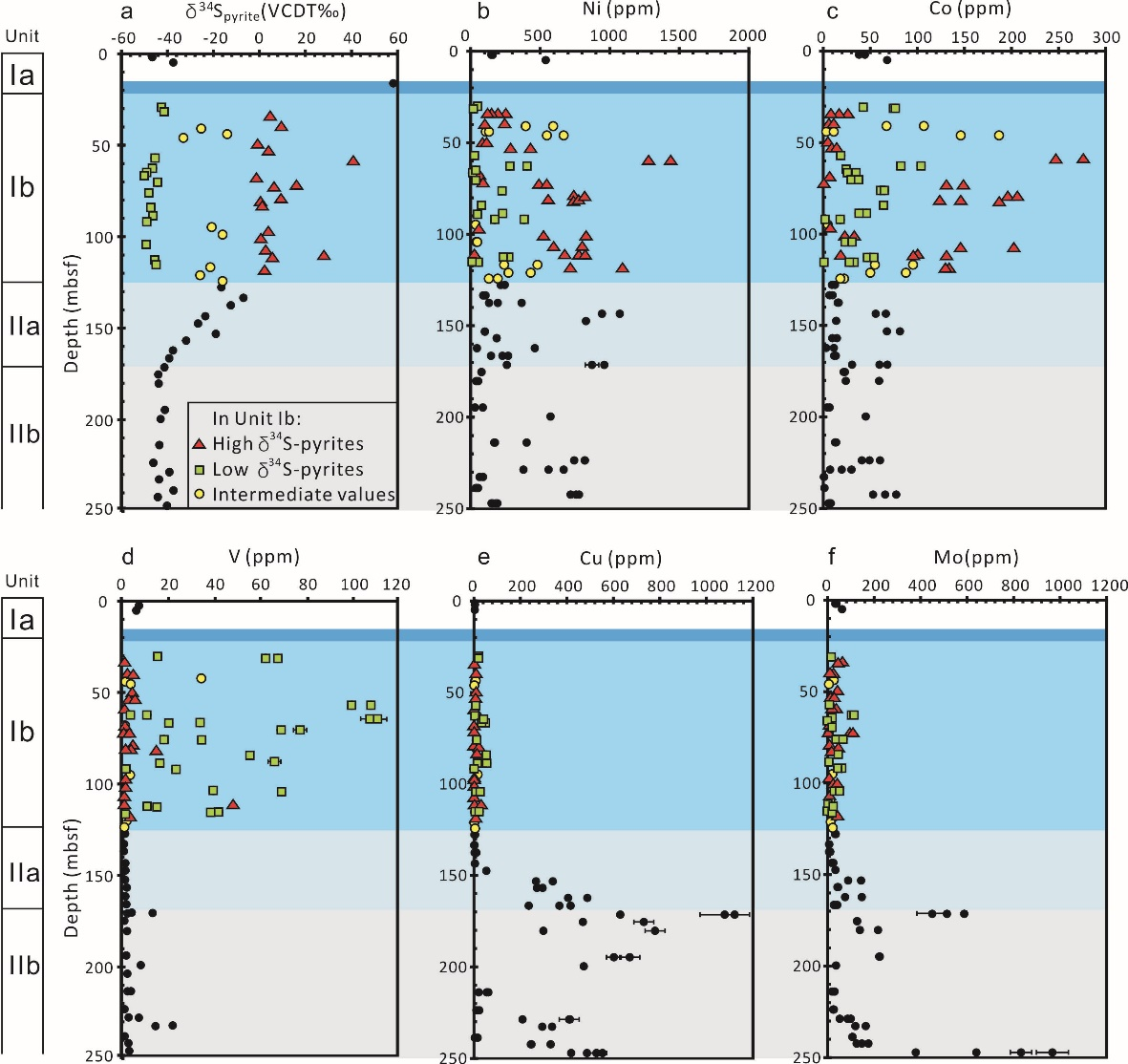 图1 (a)黄铁矿硫同位素;(b-f)代表性黄铁矿微量元素。Unit Ib中,红色三角形为高硫同位素黄铁矿(>–4‰),绿色矩形为低硫同位素黄铁矿(<–36‰),黄色圆形点为中间值