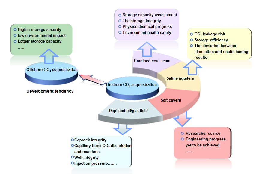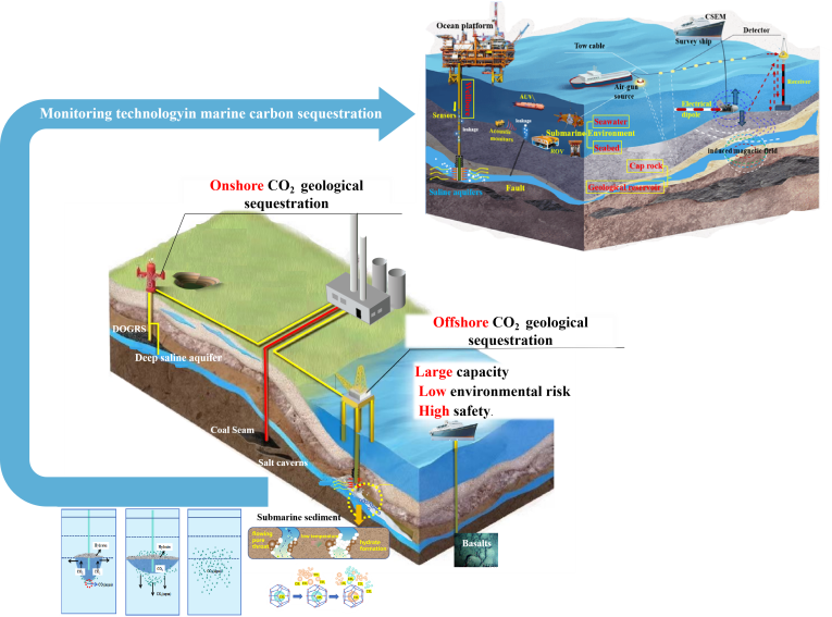 该研究全面回顾了陆域及海洋CO2地质封存技术的研究现状、理论和方法及未来发展趋势。并强调目前的CO2地质封存示范项目主要集中于油气藏协同驱替技术上。于此同时,全球CO2地质封存示范项目已经开始加速向深部盐水层储存和大规模集群化方向发展,其规模已达数百至千万吨级别。与陆地碳封存相比,海洋碳封存因其远离畜水层,安全风险较低具有更大的封存潜力,逐渐成为未来碳封存的主战场。其中,海底深部盐水层CO2埋藏是碳封存研究的关注焦点。同时,海底玄武岩矿化封存也凸显出巨大潜力。将二氧化碳以固态水合物形式封存于适宜的海底沉积物环境,或形成人工二氧化碳水合物盖层,有助于协同天然气水合物资源安全高效开发,已逐渐成为新的热门研究课题。未来,二氧化碳地质封存的重点应放在海洋碳封存潜力的精细评估、选址优化、注入工艺及安全监测方面,实施涵盖捕获、运输、注入和地球物理全过程监测的海洋地质碳封存示范项目,并建立一个集地质-工程-环境一体化的智能、实时和专业的碳封存数据库。