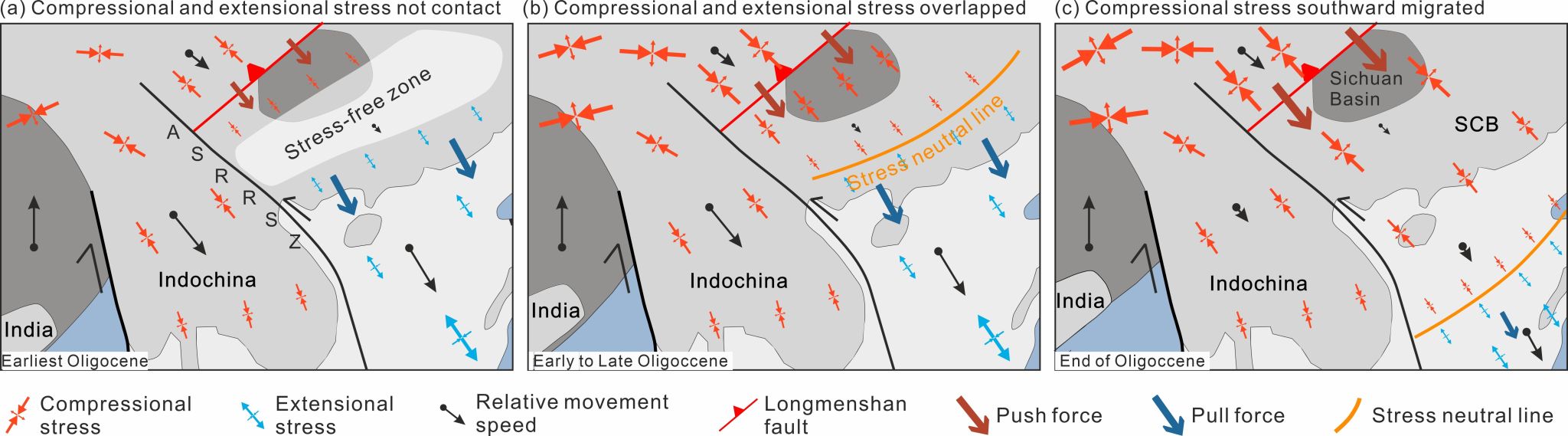 近日,探花视频 任建业教授带领的“大陆边缘动力学”研究团队在构造地质学领域国际顶级期刊《Tectonics》上发表了题为“Differential Extrusion of Indochina-South China Block and Its Interplay with Slab-Pull Tectonics: Evidence for End-Oligocene Basin Inversion in the Beibuwan Basin”的学术论文。该研究揭示了渐新世末期南海西北部广大区域内发育的(正)反转构造体系,标志着该地区新生代期间长期的走滑伸展成盆过程结束,进入到新近纪幕式构造挤压演化阶段。论文强调了这一构造反转作用是一个具有统一动力学背景的区域构造事件,创新性提出“双动力混合模型”和“应力中性线”等新概念,合理解释了渐新世末期南海西北边缘发生的这次强烈的构造体制转换,指出挤压应力源于松潘-甘孜地体的挤出作用,并与古南海俯冲-拖曳作用协同控制了南海的发育和演化过程,而挤压应力区和拉伸应力区之间“应力中性线 (Stress neutral line)”由北西向东南迁移引发了南海西北陆缘盆地广泛的构造反转、华南东南部的南岭附近抬升-夷平,南海西北次海盆停止扩张以及扩张脊南向跃迁等区域性的构造现象(图1)。