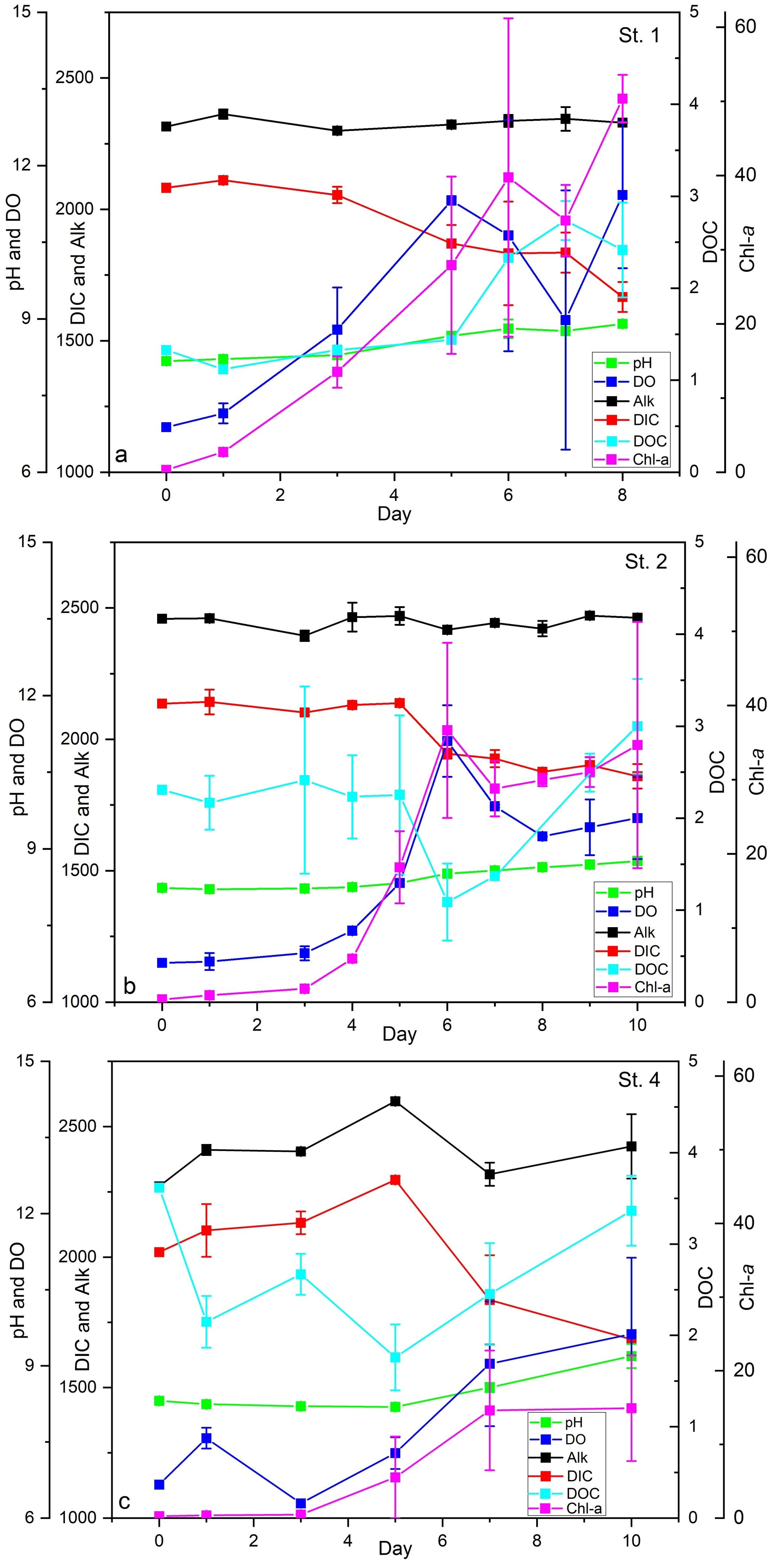 2020年秋季表层海水的培养实验结果显示,DIC吸收速率大小依次为:站位1>站位4>站位2,而叶绿素含量的增加速率大小顺序为:站位1>站位2>站位4。这种差异表明站位2的初级生产力相对较低,而站位4的光合效率较高,这与光照、浮游植物的组成和丰度有关。