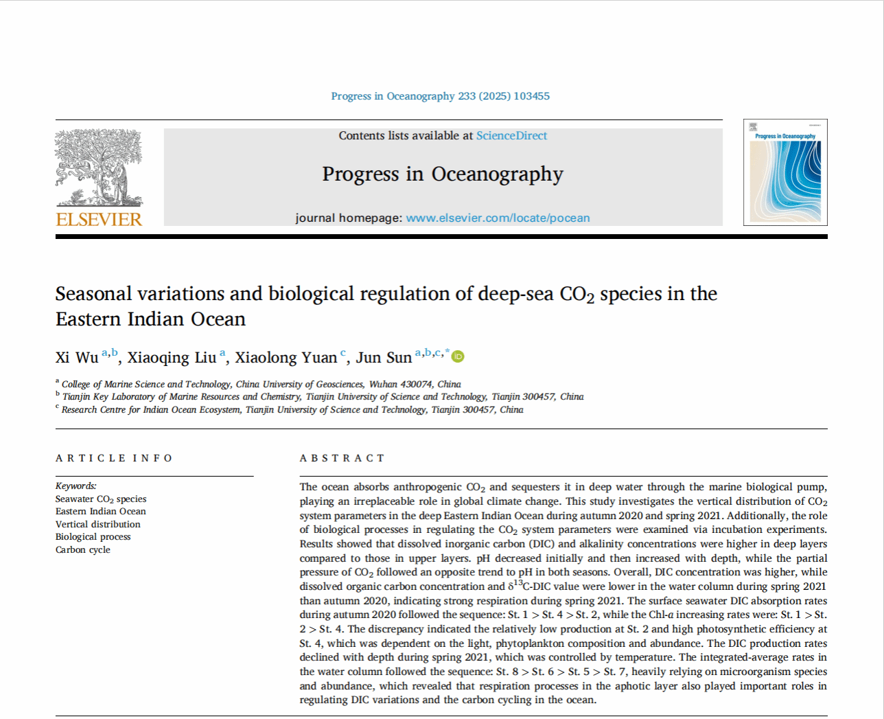 Wu X, Liu X, Yuan X and Sun J (2025) Seasonal variations and biological regulation of deep-sea CO2 species in the Eastern Indian Ocean. Progress in Oceanography 233:103455.