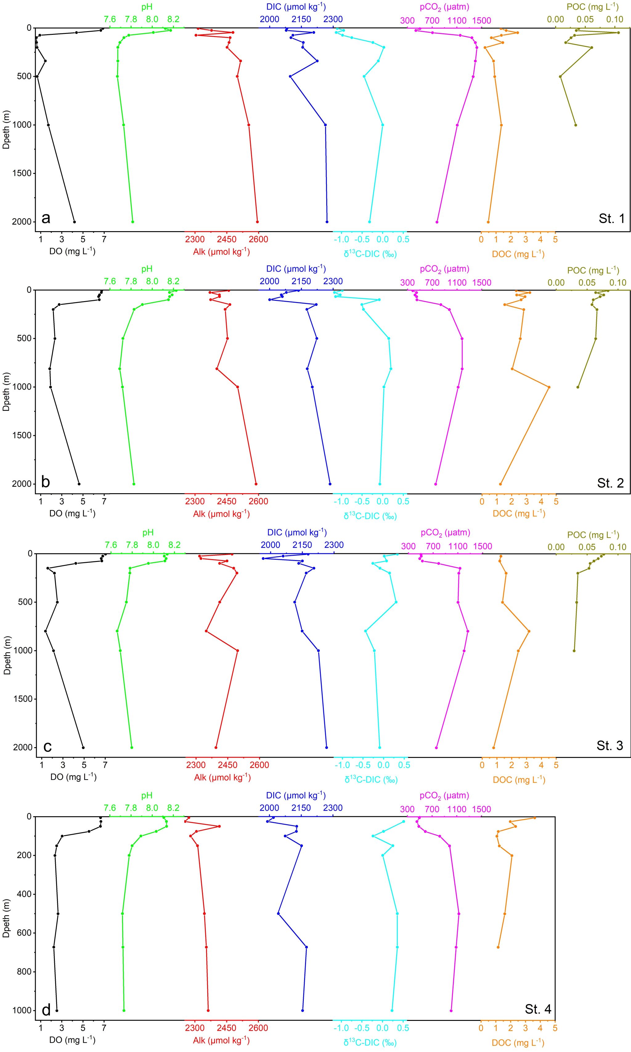 本研究调查了2020年秋季和2021年春季东印度洋深海二氧化碳系统参数的垂直分布情况,通过培养实验探究了生物过程在调节二氧化碳系统参数中的作用。总体上,深层海水的溶解无机碳(DIC)和碱度(Alk)含量高于上层水体;pH随深度出现先下降后升高的趋势,而二氧化碳分压(pCO2)的变化趋势则与pH相反。季节差异上,2021年春季水体中DIC浓度较高,而溶解有机碳(DOC)浓度和δ13C-DIC值低于2020年秋季。