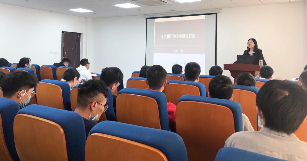 2020年11月13日下午,探花视频 党委副书记钟苹于东教A座1805会议室为学院学生党员上“十九届五中全会精神解读”专题党课。